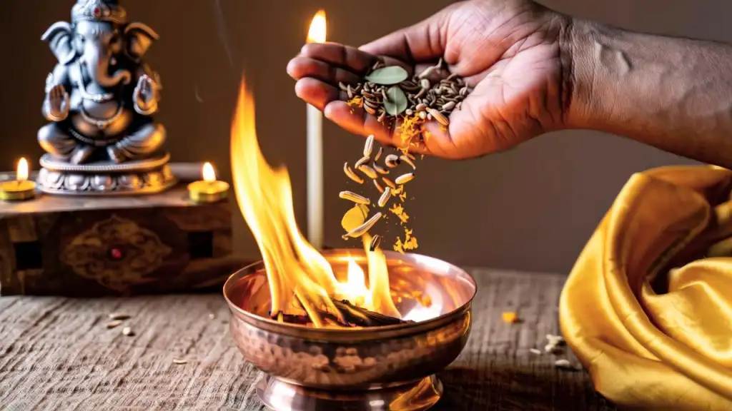 2. Light a diya with ghee. Add a pinch of samagri every 15 minutes for 1 hour.